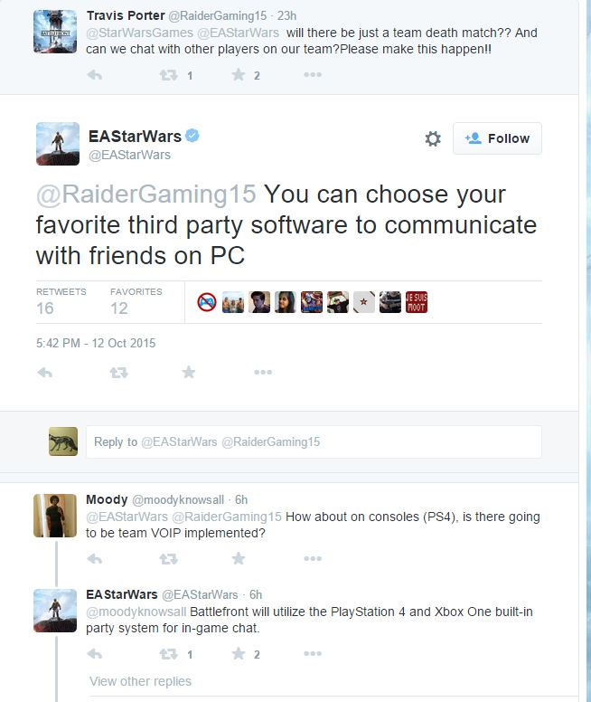 EA is keeping the Star Wars hype alive by trickling out a steady stream of news about the final release of Star Wars Battlefront. The latest bit of news is to say the least controversial, EA today through a series of tweets confirmed there will be no “ingame” chat in Battle Front. The tweets are below, but the gist of it is that 3rd part voice clients are going to be needed to talk to anyone in Star Wars Battlefront.